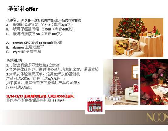活动形式:NOOS美容中心设立圣诞祝福卡架和NOOS专属圣诞卡,期间所有到店会员(买单老客人)可在店内挑选一份圣诞礼及写圣诞祝福送给亲友,同时自己还可获得贝德玛润唇膏一支(400支先到先得)。